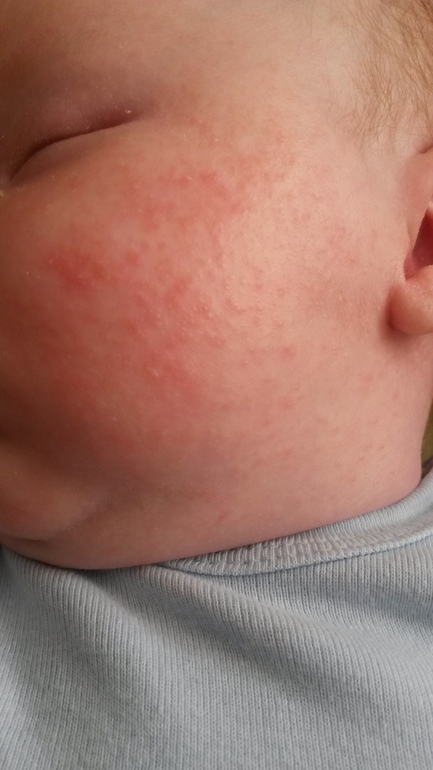 АллергияИ так,сына(1 месяц) начало сыпать.сыпь какая то мелкая как точки,на лице дошло до небольшой корочки.сначала я подумала,что это потница,потому что дома жарко,а теперь уж даже не знаю.сырь на лице,шее,немного на ручках,ножках и голове..я знаю,что тут есть мамочки,которые сразу по фото определят аллергия у нас или нет.я ребенка умываю по 3 раза на дню,купаю 2 раза,но сыпь то не проходит уже больше недели!!!ну и фото