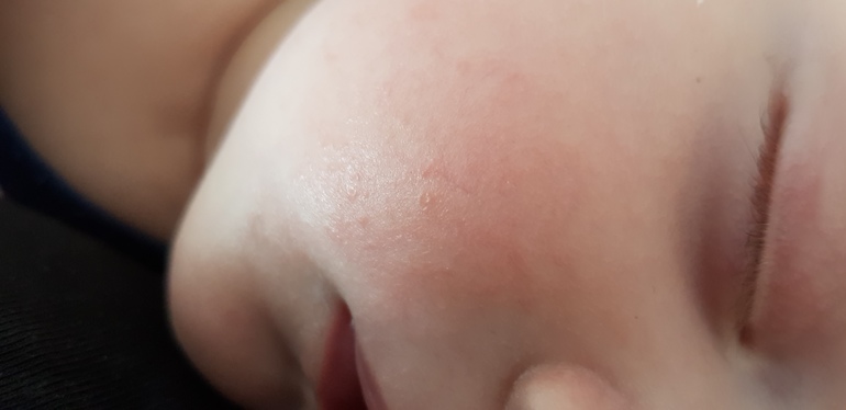 Я на диете и ничего нового не ела, но у дочки тоже шершавые немного щечки и чуток розовенькие. Врач ничего страшного в этом не увидела. Сказала, либо обветрило на улице, а мы как раз катались с открытым капюшоном коляски, или ручками натерла, так, как усердно сосет кулачки.