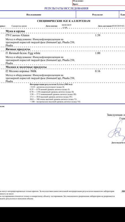легкая аллергия на глютен и яйца, на молочку нормально. но я бы все равно убрала молочку, так как молоко делится на множество составляющих, типа лактозы, море белков и еще кучи всего.