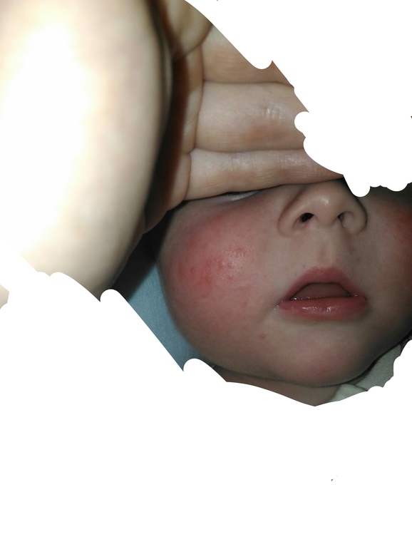 Высыпания на кожеПоследние пару дней у малыша высыпало на щечках, в особенности на правой. На ощупь щечки не горячие, гладенькие за исключением вот этих "прыщичков".