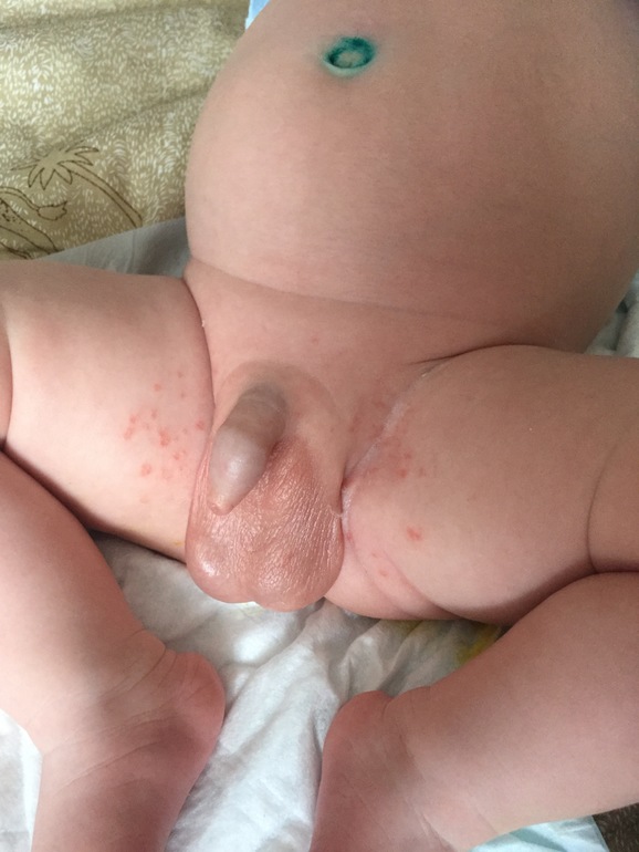 Ребёнку 1 мес. Сыпь в паху, где-то две недели, сначала были маленькие пятна, лечились метилурацилом и фенистилом, у ребёнка постоянно сопли где-то в носоглотке, наружу ничего не вытекает, сейчас сыпь появилась на животе и груди, помогите, не знаю что делать, педиатр говорит атопический дерматит , выписала адвантан и неотонинЛия