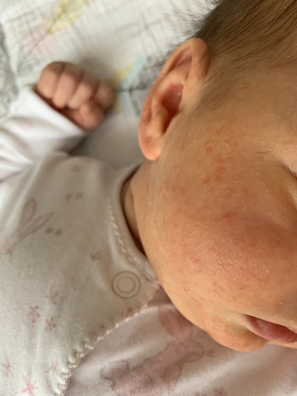 Недавно были ещё высыпания на шее, красные с белыми гнойничками.. педиатр сказала убрать молочку. С шеи местами ушло, на лице осталось..