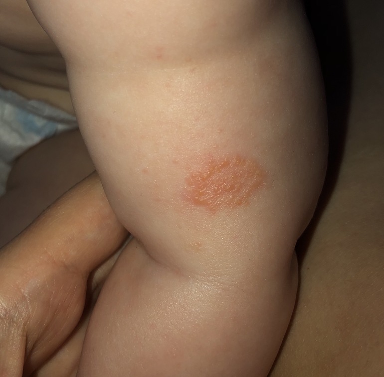 АллергияСначала на этом месте были маленькие прыщики, как мелкая сыпь, потом где-то через неделю образовалась корочка, не проходит недели две наверное, мажу эмолентом. Что это может быть? Фото под кат