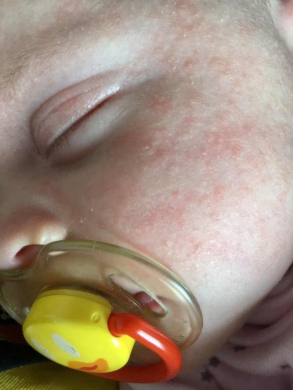 Неделю назад начались высыпания на лице , ушах. Сначала были небольшие красные прыщики , теперь стало много бледных прыщиков под корочкой. На свету особо не видно, если не потрогать, не заметишь, при плаче конечно же все краснеет.