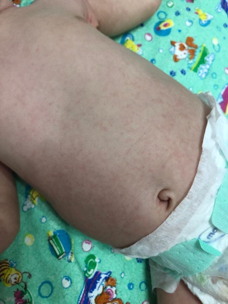 Ничем не мазали кожу? Средства ухода или Может порошок не подходит (Полотенцем вытирали не тем постиранным..) ? на фото не очень пойму сыпь это или нет