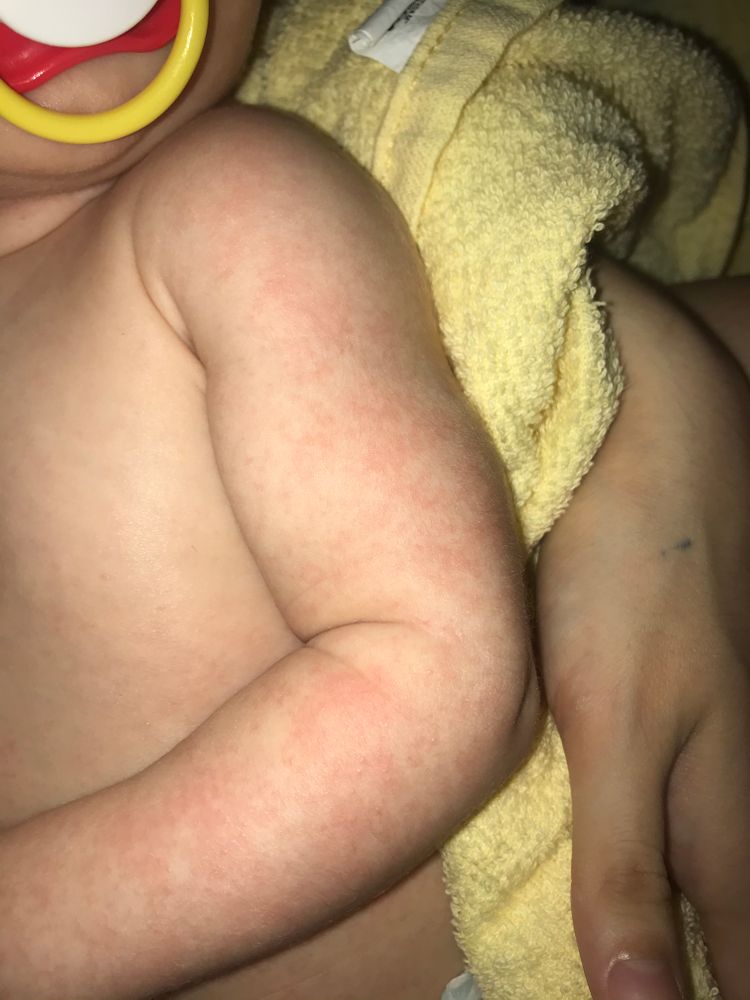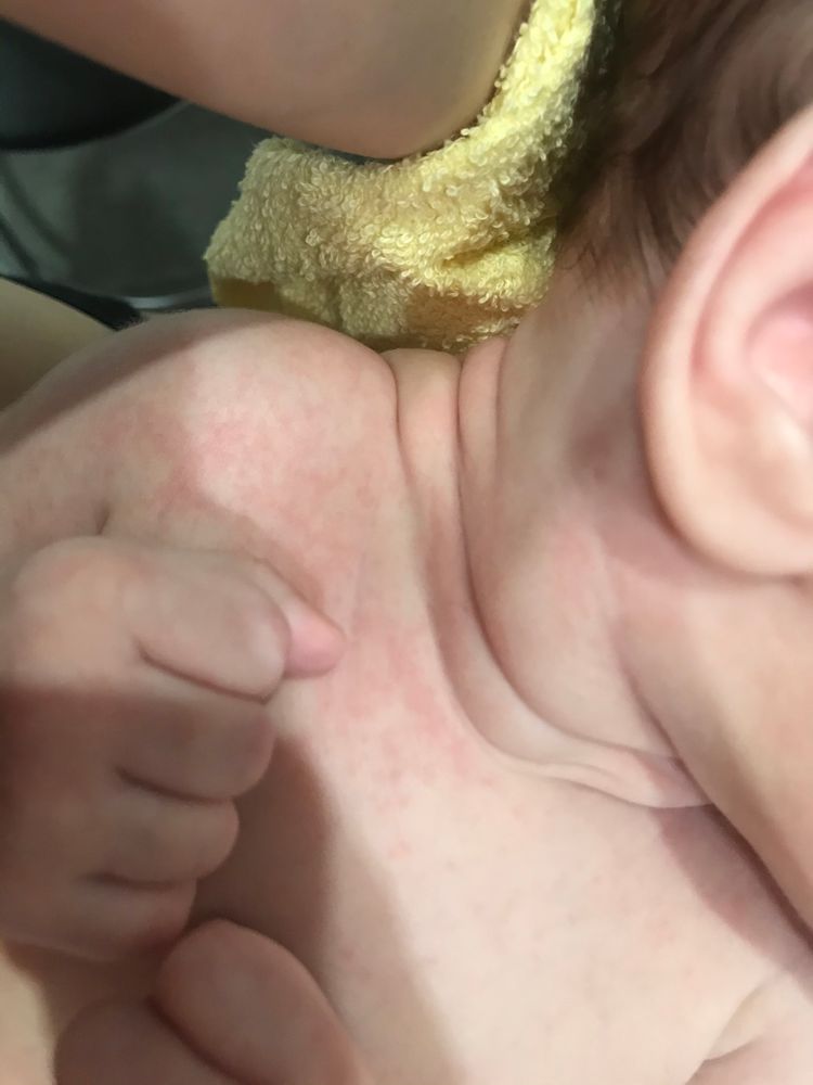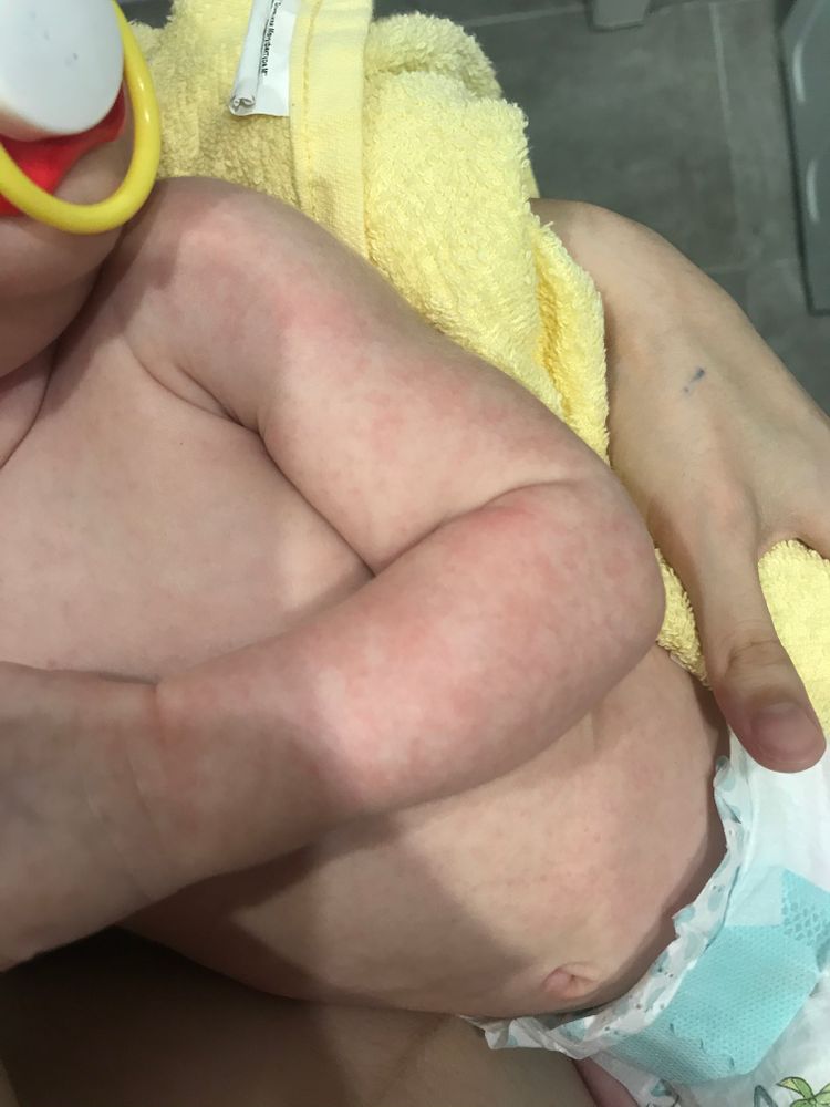 а мне кажется похоже на потницу, перегрев, что-то подобное у нас было. Может держали как-то сильно его голого руками? Но можно на всякий случай дать антигистаминное, вспомните, был ли новый порошок, какая-то одежда новая или что-то такое.