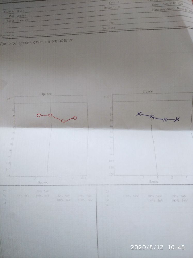 Мультик-Пультик, на некоторых частотах 20.Врач сказал, что на основании этого первую степень не ставят. И мы не успели доделать КСВП, дочь проснулась, т. е. Сигналы которые ниже 20 д. Б. не пускали. (Если я правильно объясняю). Нам пол года и в следующий вторник мы идем к сурдологу на контроль. С самого начала врач говорила, что раньше 6 месяцев рано делать выводы, так как слух еще развивается.
