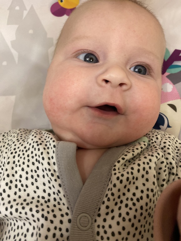 А вот как на фото так и в живую, чуть сухие щёчки коленки и локти и немного розовых шелушений на животике сейчас фото поближе скину