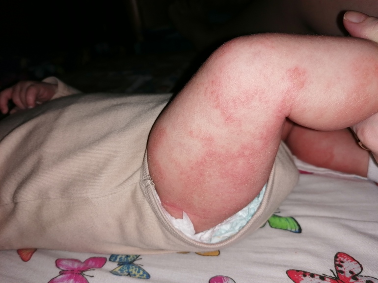 Высыпания на кожеДевочки помогите. Ребенку почти 2 месяца. Ноги за последние 2 недели превратились в какой то ужас, вся задняя поверхность ног в сухих бляшках, выглядит ну очень страшно. Шелушится чешуйками, красное, ну и очень сухое. Щечки немного суховаты, но там не так критично.Я предполагаю, что это пищевая аллергия (у нас ГВ) диету я не соблюдала. Когда только начало появляться, я ограничила себя в молочных продуктах и в сахаре (в виде всяких печенек, булочек), но все эти шелушения продолжают увеличиваться. Что делать? Садиться на одну гречку? И еще, чем помазать, чтобы увлажнить и подлечить?