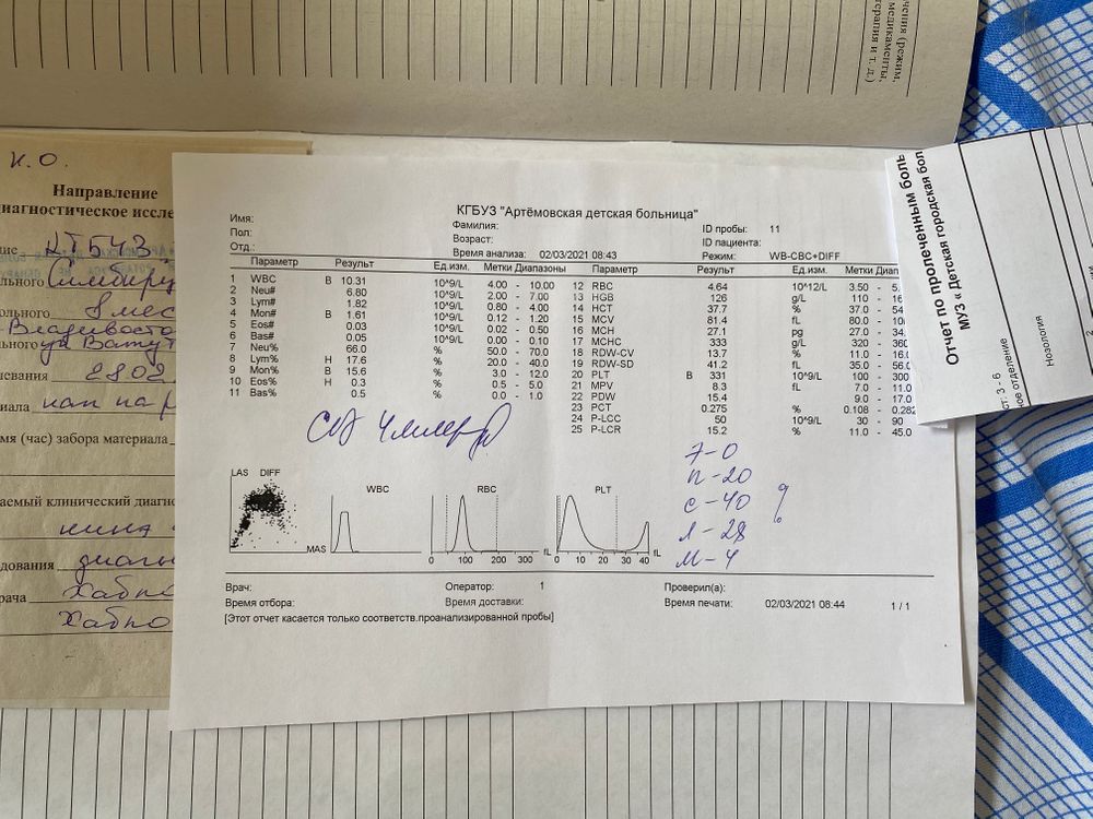 Лежим в кишечке с бактериальной инфекцией , какая пока не понятно. Поступили 2.03 в больницу. Началось всё 28.02, рвота 2 раза, потом все хорошо, 1 числа поднялась температура высокая, вызвала скорую, отвезли в больницу.