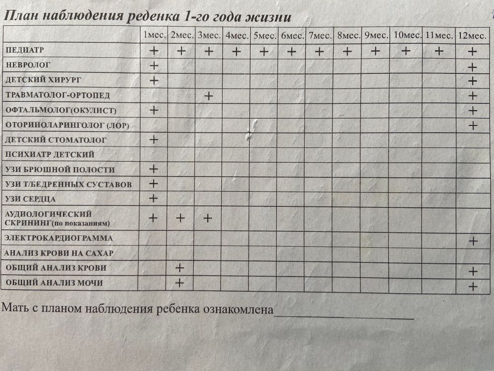 Обследования обязательные в месяц : нсг, эхо-кг, узи тзбс, вроде все из исследований, специалисты - педиатр, невролог, хирург, ортопед, окулист