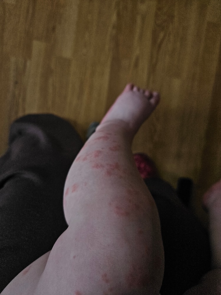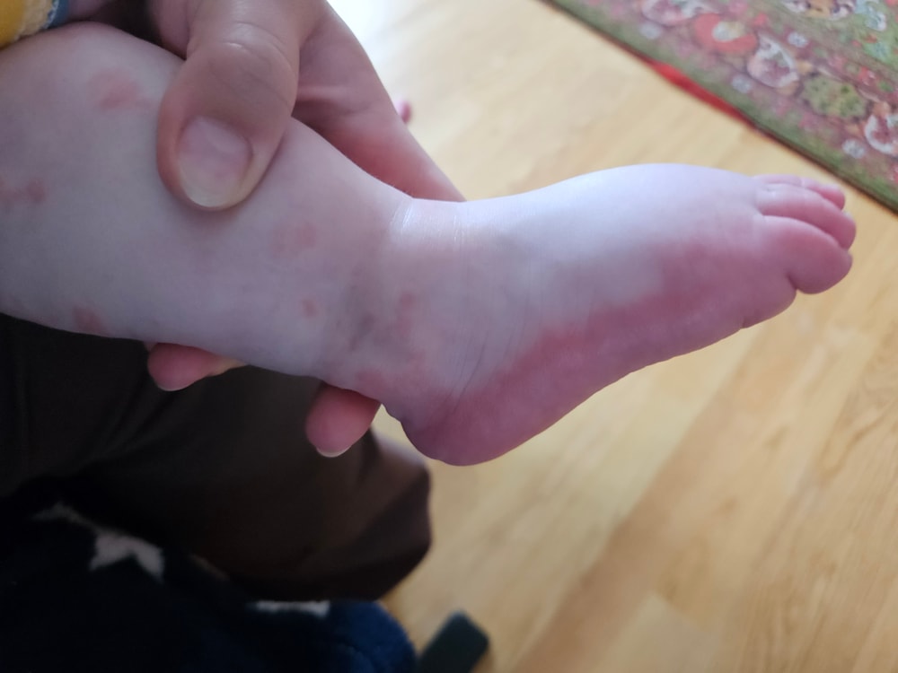 Ребенку 11 месяцев, утром обнаружила такие пятна на ногах, новые продукты не вводила, температуры нет, не чешет, врача вызвали но когда он придет не знает ни кто.