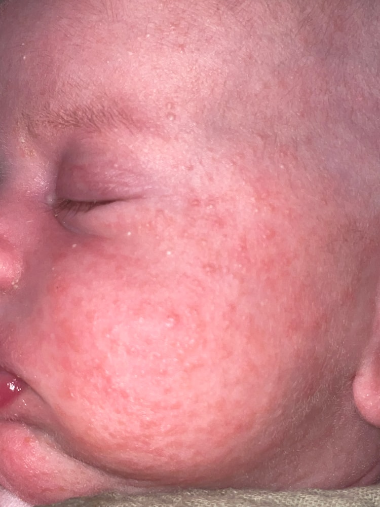 Может у кого было такое же проявление акне? Прыщики краснеют когда она плачет в основном, ну будто пятнышком.