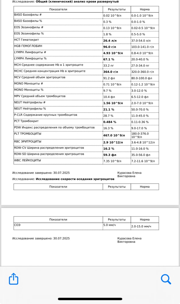 У малышей другие нормы. С тромбоцитами всё в порядке, они повышены для того, чтобы у них заживало всё быстрее😄 гемоглобин тоже нормальный, малышам свойственна физиологичная анемия. И лимфоцитоз тоже. А по остальным показателям отклонения потому что они рассчитываются друг от друга