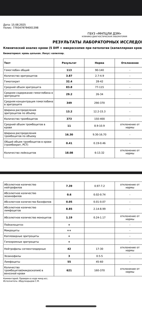 Алена, ну цифра тромбоцитов и смутила) 621 при норме до 400…плюс пойкилоцитоз тоже доверия не внушает