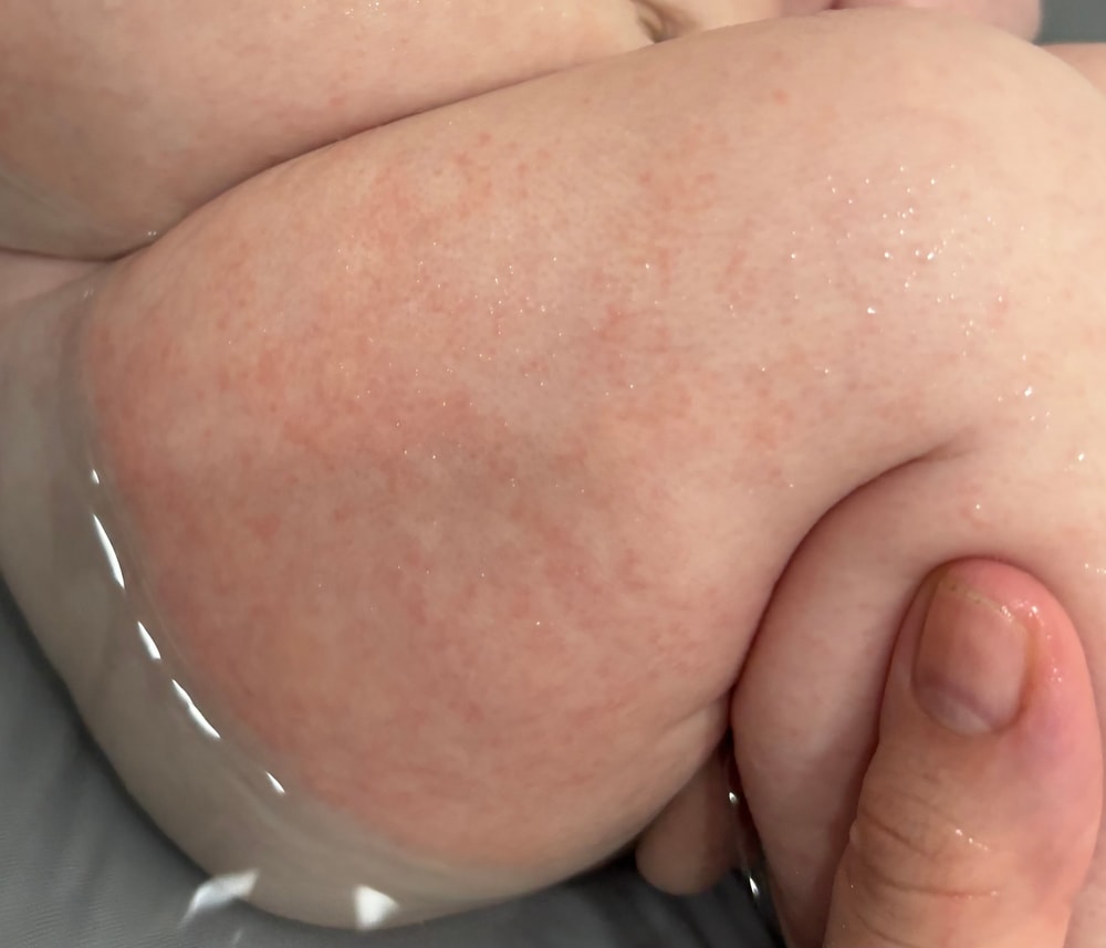 У моего сына была похожая. Возможно это на какой-то постоянный раздражитель. Тоже сыпь была на ногах и животе. У моего это был на порошок или гель для зубов, гель убрала, порошок поменяла и всё прошло