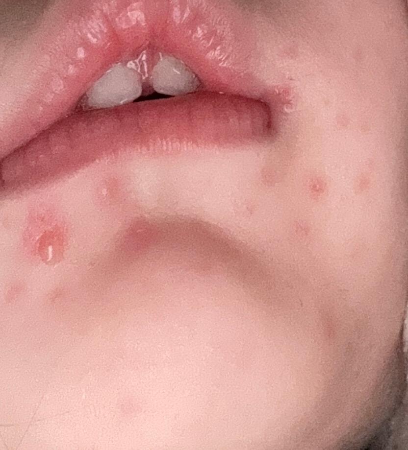 сегодня у ребенка высыпало все руки,тело,ноги и вокруг рта ,половые губы тоже в прыщиках и все сильно красное