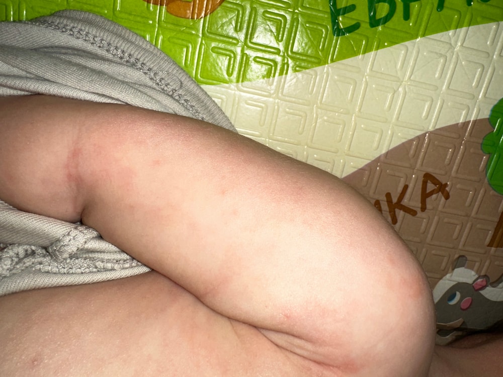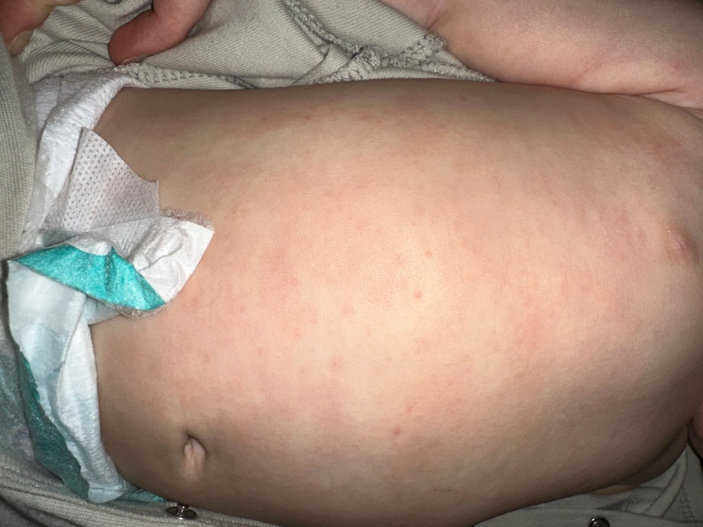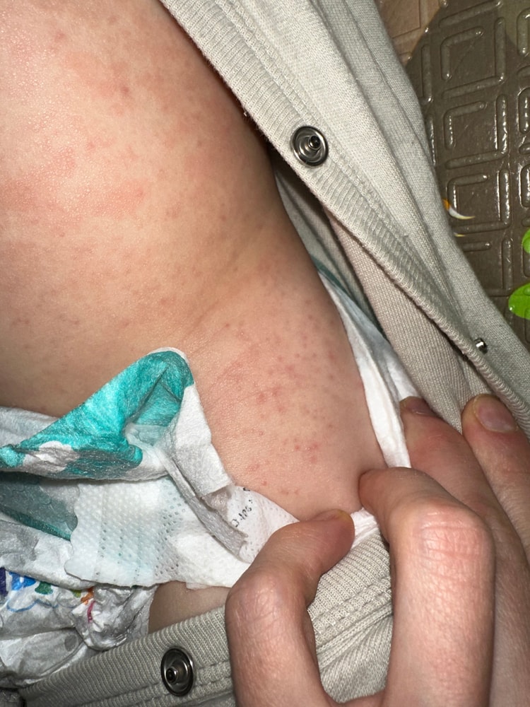 у моего сына, ему 8 месяцев недавно появилась вот такая сыпь или пятна по всему телу в том числе и на местах подгузников. Так же появились маленькие беленькие прыщички.