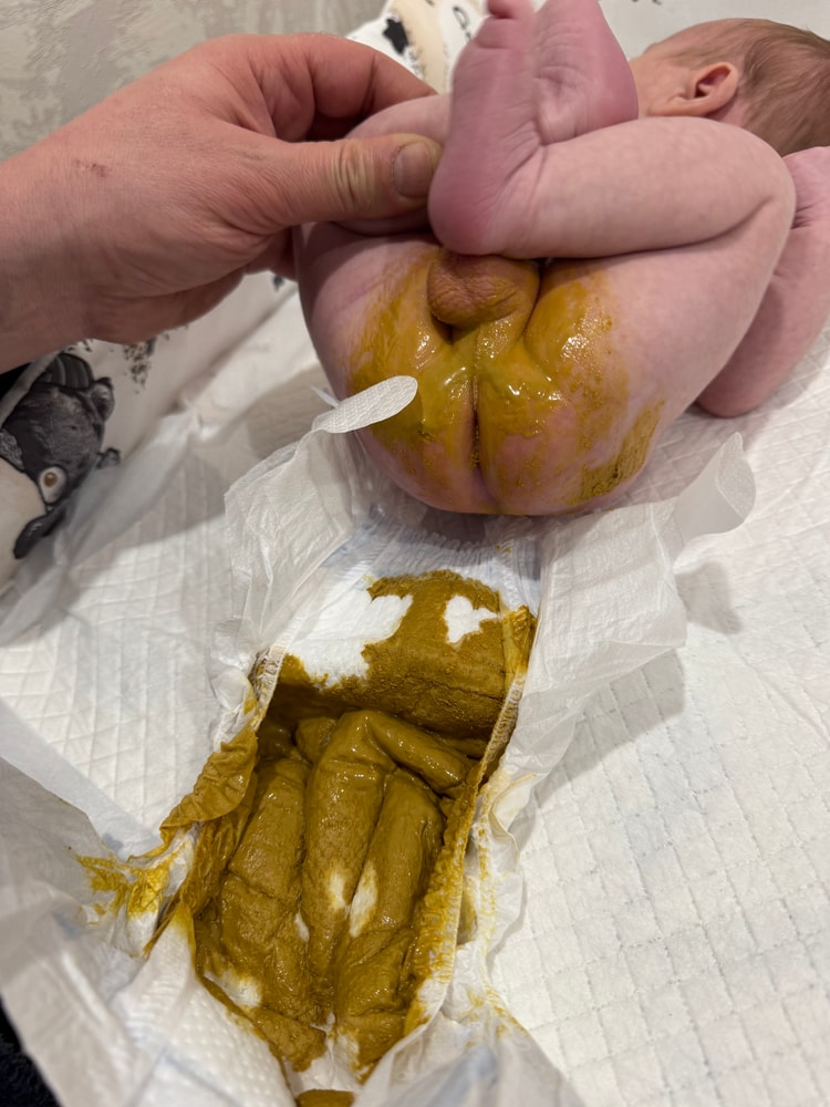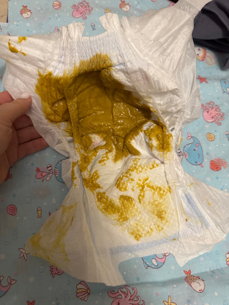 Здравствуйте. Нам только месяц, около двух недель назад сходил вот так первый раз, звуки как при поносе у взрослого, прям громкие и яркие так скажем. Был день сходил два раза так. Первое фото сходил в воскресенье потом вообще не какал и только в среду сходил, второе фото. Я переживаю у него понос? Или это нормальный стул для ребенка. Питание смешанное