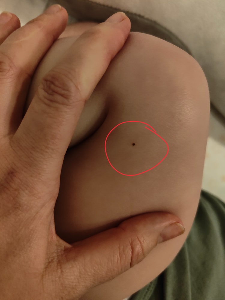 Может это не родинка ,а тромбированная гемангиома ,? Плохо видно по фото . Надо было крупнее фото делать . Попробуйте еще со вспышкой ,иногда лучше видно становиться .