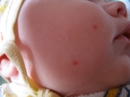 вчера появились два вот таких пятнышка, ярко-красного цвета! мы решили что это может комарики укусили у нас они уже проснулись от зимней спячки! но сегодня к утру еще одно на другой щечке появилось!