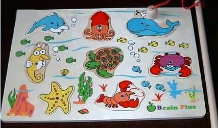 рыбалка прям правда клевая. это пазл. на удочке магнит. нужно подцепить ей рыбку, звездочку и т.д. и вытащить. есть аналоги из пластики, но я как-то люблю древянные, натуральные и не так быстро ломаются