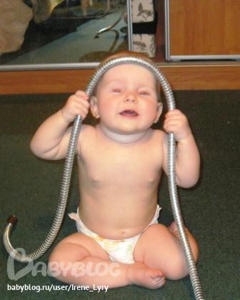 Выходит на четвереньках (язык не поворачивается скахзать "выползает", так бодро мы гарцуем ))) в коридор, и - прямиком к папиным тапкам, в которых он ходит курить в подъезд, или к моему тренажеру, который тоже потенциально опасен... (((