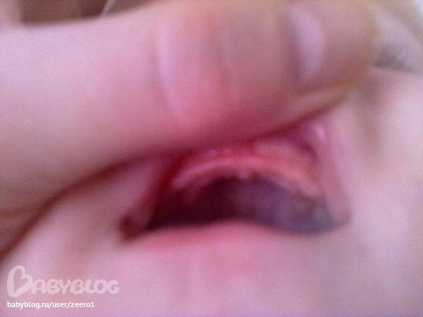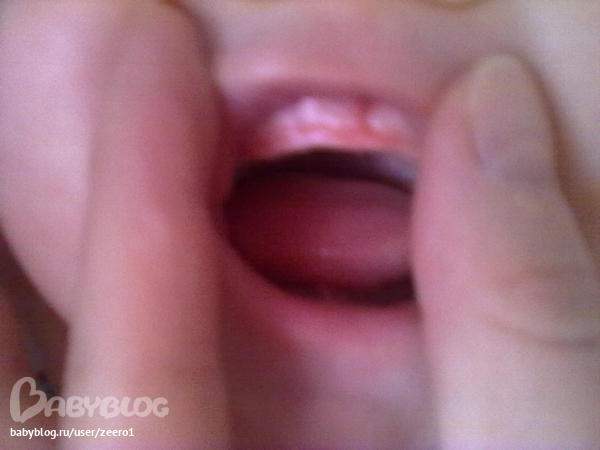 Это зубы, но вылезут где-то через недели 3-4. Видите сколько ее до края десны? У нас тоже так лезут, только уже боковые верхние и резцы, сначала думаа раз набкли, то все вот ща будут-ни фига, они долго лезут. Ообенно верхние, они более широкие,чем нижние.