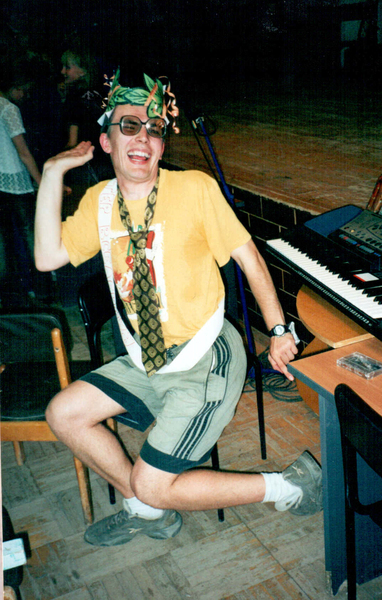 Вася Педалькин (он же мой муж), представитель команды вожатых на конкурсе "Мистер какой-то там" в детском лагере.