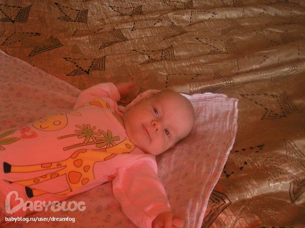 Начали улыбаться))) Когда в ванне купается, не просто дрейфует с безмятежным видом, а быстренько "бегает" туда-обратно и еще любит крутиться на одном месте. А еще научилась переворачиваться с живота на спину, чем очень меня удивила. Ведь голову держит еще плохо. И вообще на животе лежать не любила, очень быстро кричать начинала. Наверно, потому и переворачивается, что очень не нравится на животе лежать)))