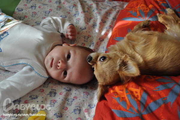 А у нас, как только ползать начал, сразу к собаки, и теперь от нее не на шаг.