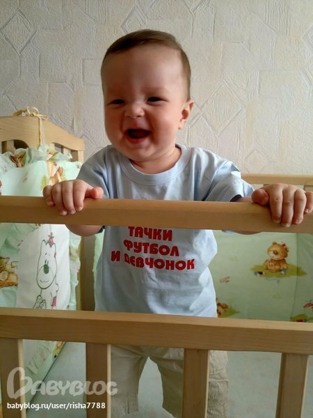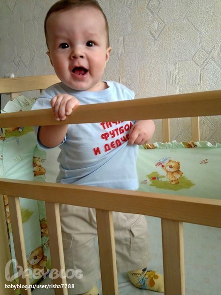 ХвастаемсяОколо 7 мес. стал сам потихонечку вставать в кроватке, теперь уже уверенно стоит и пытается ходить по периметру, умничка мой!