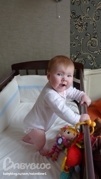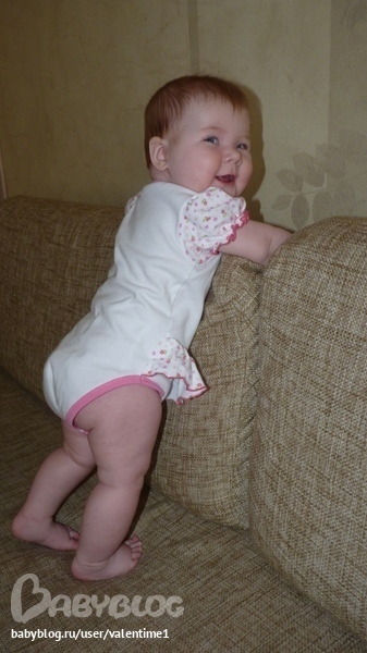 такая классная-особенно в таких бодиках)))Мы тоже научились вставать и за последние три дня успели упасть назад переды два раза-манеж нужная вещь-спасает хоть ненадолго,а то этих "любознателей"не на секундочку нельзя оставить