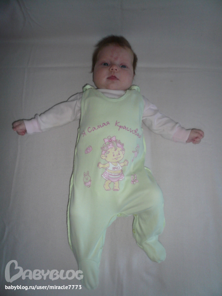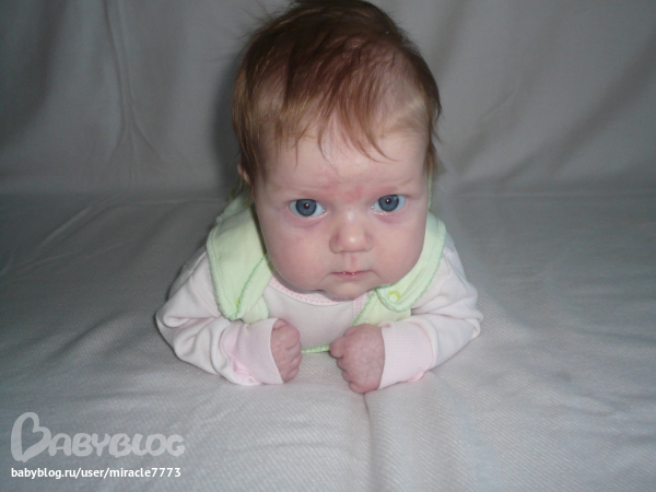 ХвастаемсяСегодня Аришке 2 месяца. Как же время летит. Кажется я только недавно 2 полоски на тесте увидела. Но ладно, сейчас не об этом. Весит Плюша не много не мало 5350(+ 800г), рост намеряли 60 - 61 см(+ 4-5 см). Голову держит неплохо, хотя конечно еще "кивает". На животе может минут 10 лежать с задранной головой. Вчера вообще мне выдала - лежит на животе и тут раз через левый бок- бряк на спину. Кладу обратно, а этот колобок - опять - бряк - и уже на спине. Больше, правда, свой подвиг не повторяла. Кулаки без промаха выдергивают пустышку и сами лезут в рот))). А еще научилась пузыри слюнявые пускать, футболки все мокрые. Болтает много, особенно по вечерам. Основные звуки это ААА на распев и ГААА))).Мой голос узнает моментально - сразу так поджимает уголок губки в улыбочку, глазви отводит на бочок и вертит головой в поисках мамы))). Когда видит мое лицо во всю улыбается))). Купание как-то уважать перестала, особенно в конце когда из круга ее вынимаешь и начинаешь намывать ей голову и прочие части тела - вот тут начинается ругань и крик. И когда вынимаешь никакие процедуры делать не дает - ни нос, ни уши почистить, ни тем более ногти подстричь. Поэтому делаю все бегом и сразу есть. Тогда успокаивается.