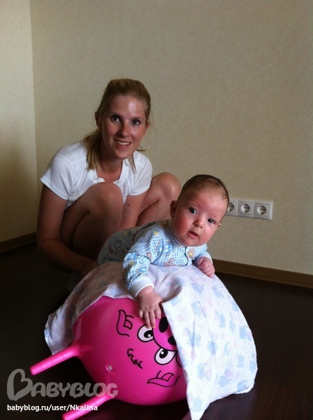 Мы катаемся на животике и на спинке и прыгаем на мяче лежа на животике (смеется когда прыгаем )) )