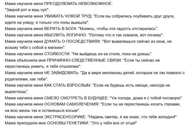 мне от мамы тоже многовато доставалось_ но ничего конкретного вспомнить не могу_ кроме одного_ что была ИДЕАЛЬНЫМ ребёнком- так в кого же мои чертятки?!