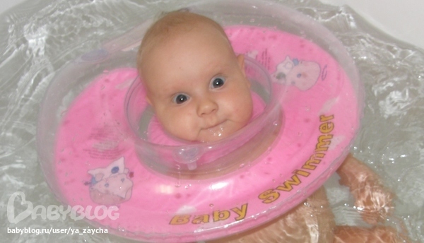 Мы плаваем, он ножками отталивается и назад голову запрокидывает, да так, что вода заливается во внутрь круга, где подбородок лежит и приходиться ее выливать.