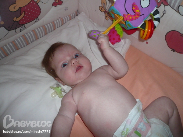 ЭмоцииПокормила Аришку, перекладываю ее на кровать чтоб памперс поменять - а у нее рученки в стороны разлетелись, так она напугалась, глаза по 5 рублей, дыхание затаила, чую - сейчас заплачет - начала отвлекать - улыбаюсь ей, разговариваю, глажу. И так интересно наблюдать - лежит, боязно ей - рученки - то, предательски машут в воздухе сами по себе, а тут вроде мамка родная, голос знакомый, теплые прикосновения и вот она не знает - что сделать - толи зареветь, толи улыбнуться))), гримасы корчит. Улыбнулась в итоге))) Взяла контроль над ручками и теребит игрухи))). Такая смешная))).