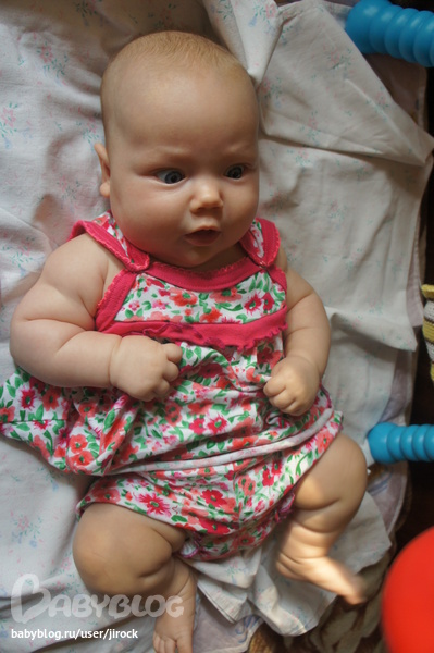 И мы лентяйки, переворачиваемся только на бочок и то в основном при виде маминой тити ))  На животе лежать не навидим, дежать голову не хотим. На этой неделе придет массажистка, удем надеятся, что все изменится. Это наша Варюша:  Вот как мы на животе лежим))