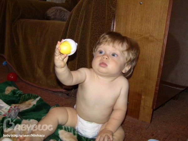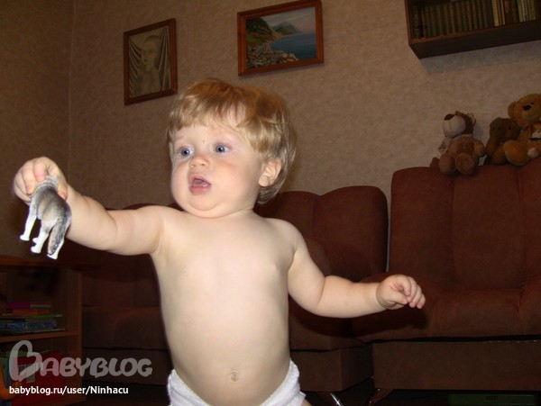 Любую вещь теперь протягивает взрослым - чтобы показали, как этой вещью пользоваться и для чего она вообще. В частности, пытается освоить механизм "выщелкивающейся" шариковой ручки. Пока без успеха.