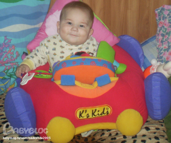 смеемся уже по настоящему . и целуемся взасос , в смысле мама вся в засосах . пищим и поем на все лады . болтаем по марсиански , но конечно же чуткий музыкальный )) мамин слух различает вполне прилично сказаные слова )))) . любим стучать ладошками по столу , сидя у папы на коленях . по достоинству оценили гречневую кашку . мы ярые мясоеды - куриная грудка с кабачком , еда настоящих мужиков !)))