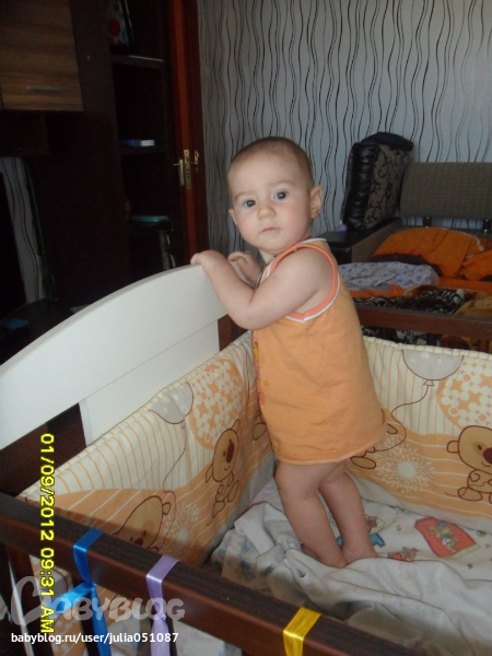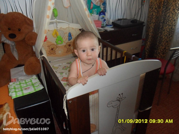 4 м.-ползает на животе,тут же попытки стоять на четвереньках(оптом правда перестал так делать до не давно:))