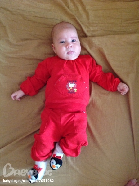 ХвастаемсяКак быстро летит время, нам уже три месяца. Наш вес 6 кг 530 гр и рост 62 см. Сашенька очень любит купаться ,качаться на качелях, гулять,кушать сисю и свой кулак. Обожает лягушку из развивающего коврика, как только видит её сразу улыбается и агукает. Очень улыбчивая по утрам и при виде папы (мама уже надоела). Говорит бу, гу, абу, агу, му, ай, ой, а, да. Следит за нами, когда мы ходим по комнате. Не любит лежать на животе, соску и чистить нос. Обожаю тебя моё солнышко..