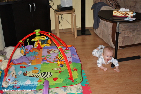 Физическое развитиеПоследние три дня, как спала температура, к Колясику вернулась физическая активность. Какие только кульбиты он не выполняет на коврике, стульчике, кроватке и тд. Вот так и стало получаться более-менее ползать. Сначала малыш выставлял вперед ручки, а затем подтягивал к ним все тельце, на следующий день стал поджимать к себе коленки и локти - в результате он почти научился вставать на четвереньки, ну а сегодня его ползанье было как в первй день только наоборот - ручки на месте, но зато ножки двигаются как положено при ползании, при этом все тело движется вперед усилием ног. Еще немного и стратегия ползанья будет отточена до идеала))) Колясик выберет для себя наиболее удобный метод!