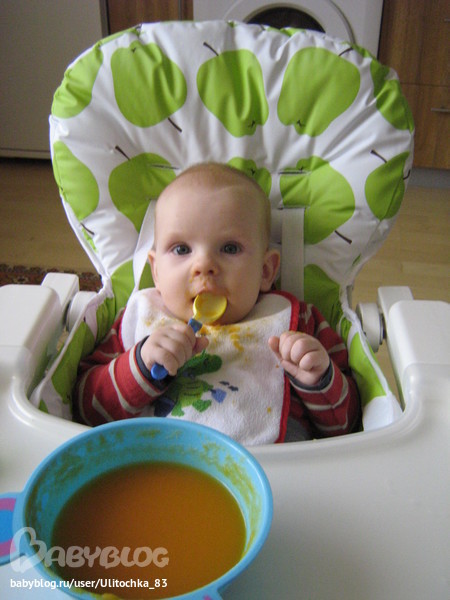 не подумайте, я не издеваюсь над ребенком и так он у меня не сидит сам....вчера закидывала стирку, приволокла корзину с бельем на кухню( машинка у меня на кухне) на корзине стояла эта миска...капеццц, как он к ней тянулся и психовал, пока я ее вот так ему не поставила....короче Илюха в домике)))...уже ввели все овощи, ест когда как, то с неохотой 70-100 гр, то с аппетитом может и 150