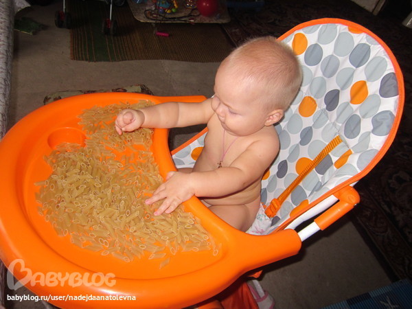 - Почти точно берёт мелкий предмет двумя пальчиками. Занятия с макаронами прошли успешно)))