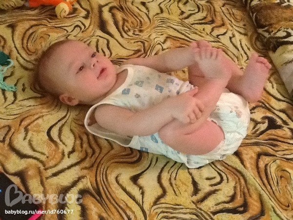 а еще массажистка сказала, что самое врмя учить ползать по-гусенечьи - это ребенок на животе, вы ему обе ножки в коленях согнули и к туловищу прижали бедрами, а он должен как бы выстрелиться телом вперед. но моя полинка это делала через раз и всегда с воем, не получалось, она и давай ныть ))))