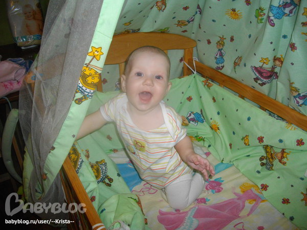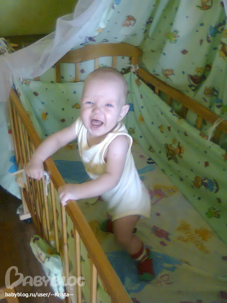 - сама подтягивается и встает на колени,а иногда и на НОГИ