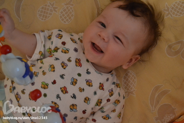 Любим лежать на животике, сами на него переворачиваемся, правда пока еще только через правый бок))) Любим смотреть телевизор, прям взгляд не отводит от него, но мы очень стараемся этому препятствовать
