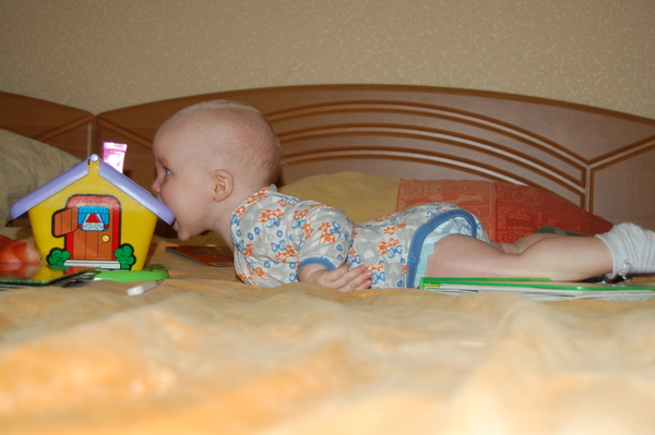Пирамидки надоели. Теперь мы колесики катаем по полу, вместе с шариками от сухого бассейна. Трам-пам-пам, что же еще. Еще мы игрушки складываем в ящик, достаем из ящика. Сбрасываем с кровати, закидываем на кровать. Избегаю очень громких, пищащих игрушек, даже если дарят - прячу.